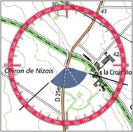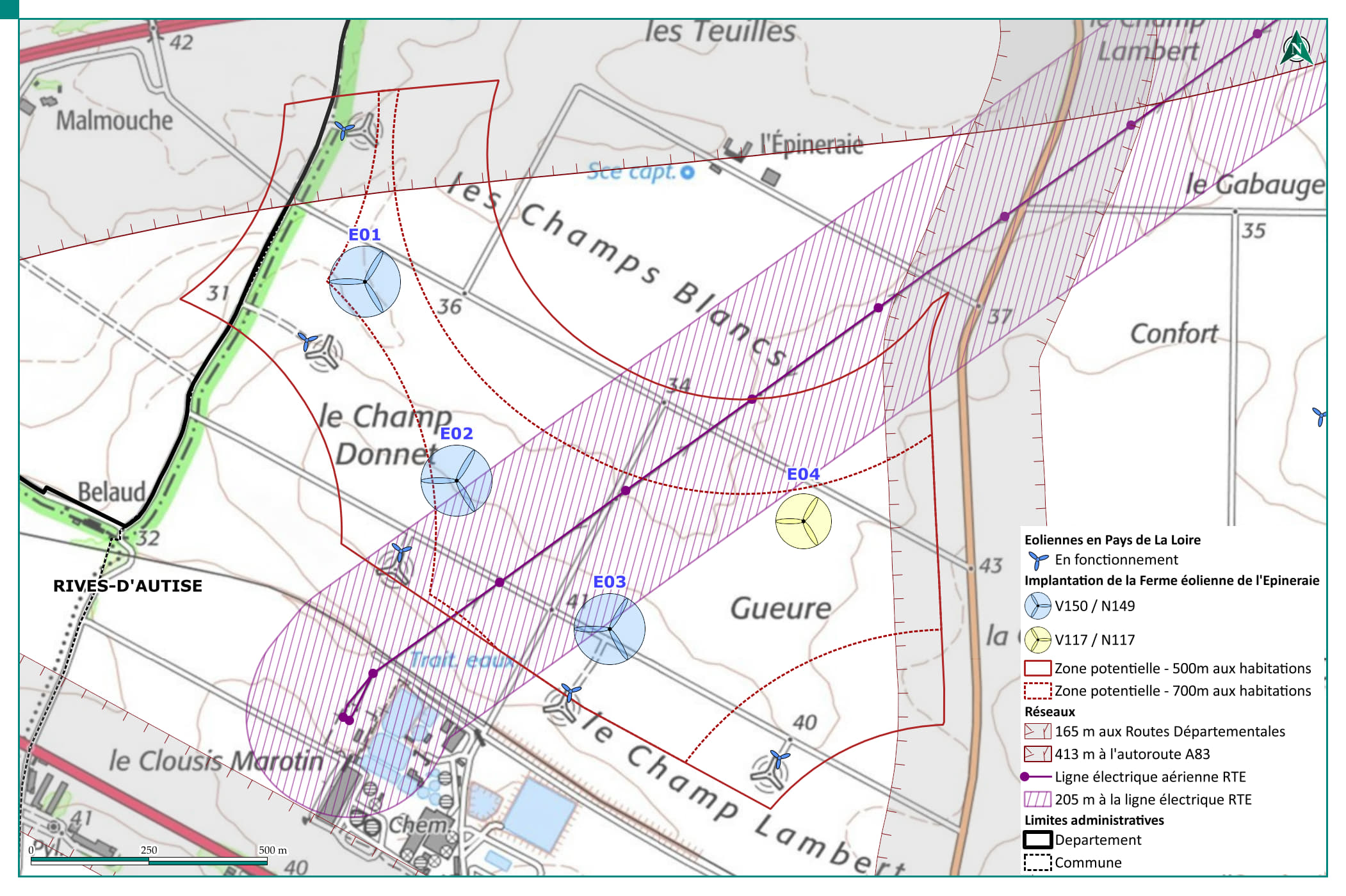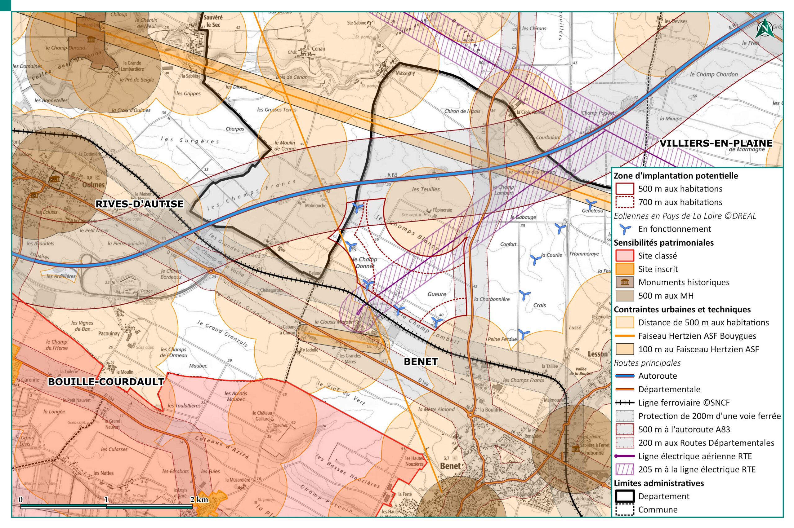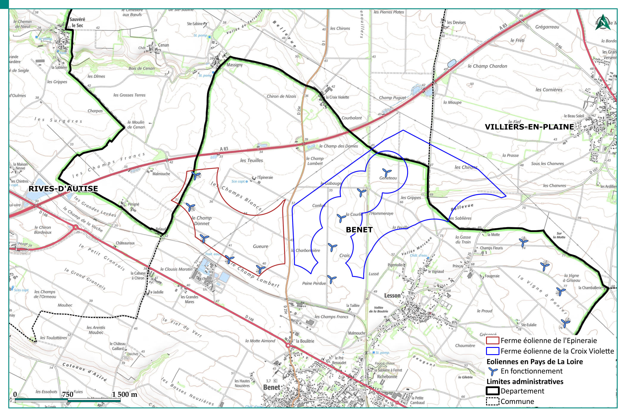 La carte, disponible ci-contre en petit, situe les zones des deux projets actuellement en développement sur le territoire : en rouge, le projet de renouvellement du parc de Benet et en bleu, le projet de la ferme éolienne de La Croix Violette (extension géographique du parc de Benet 2 actuellement en exploitation).